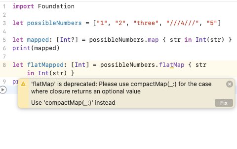 let compactMapped: [Int] = possibleNumbers.compactMap { str in Int(str) }