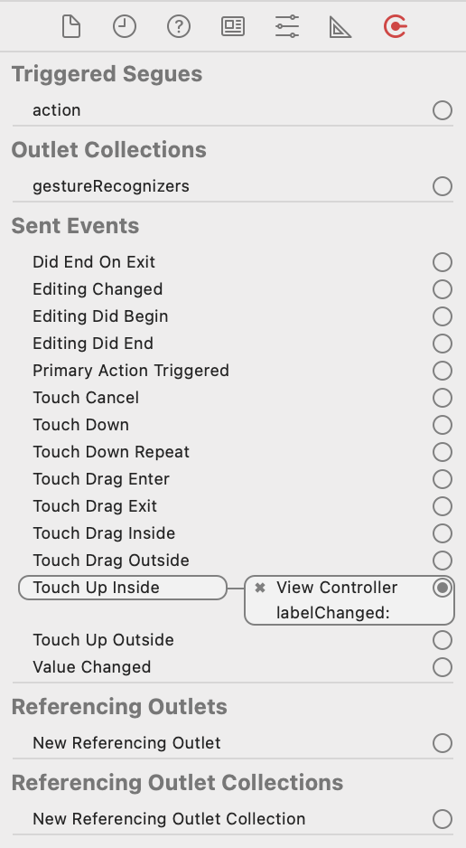IBAction을 연결한 Button 객체를 클릭한 뒤 확인해보면 아직 action이 남아있는 것을 확인할 수 있다.