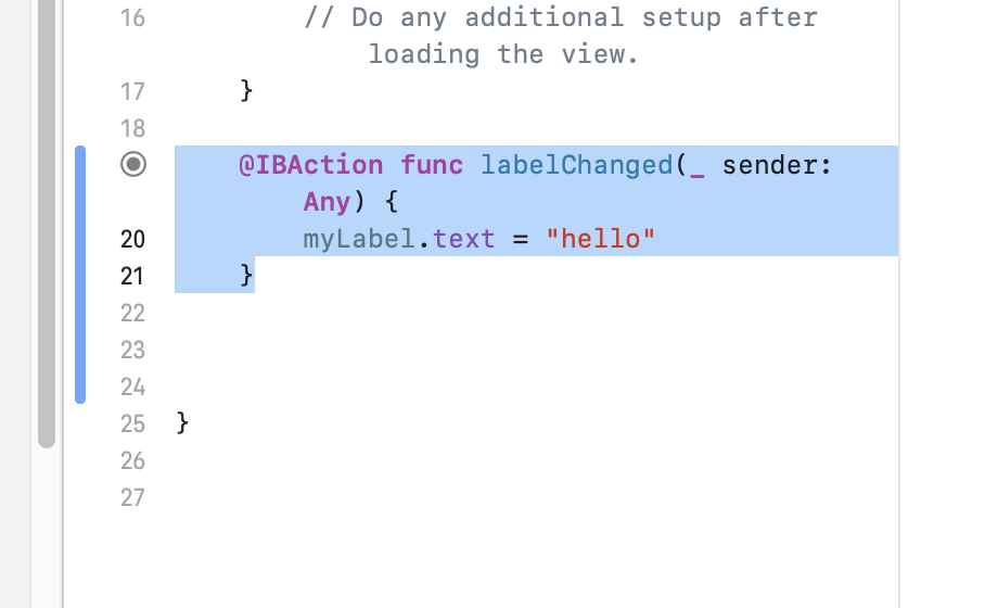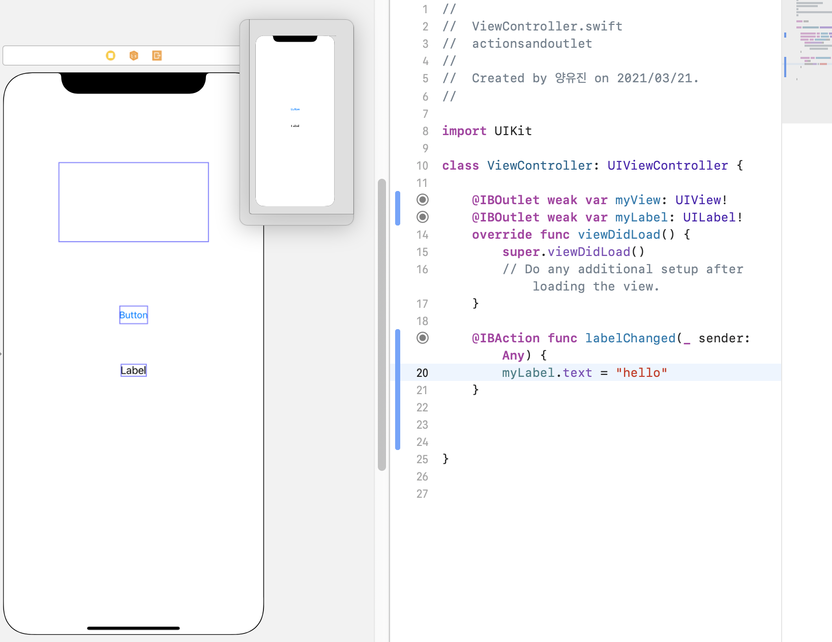 // 버튼을 누르면 Label 텍스트가 변경되게 IBAction을 Button에 연결해두었다.