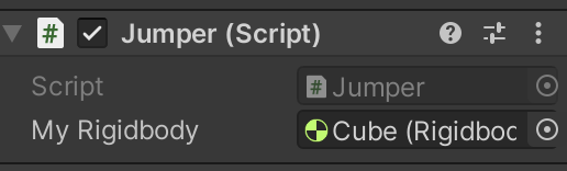 Jumper ์คํฌ๋ฆฝํธ์ ๋ณ์ myRigidbody์ Cube ์ค๋ธ์ ํธ์ ์ถ๊ฐํ Rigidbody ์ปดํฌ๋ํธ๋ฅผ ์ถ๊ฐํด์ค๋ค.