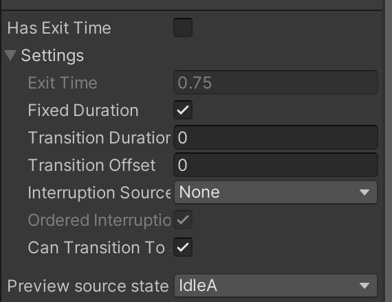 Setting์ Has Exit Time์ ํด์ ํ๊ณ ์ด๋ ๊ฒ ์ค์ ํด์ค๋ค.