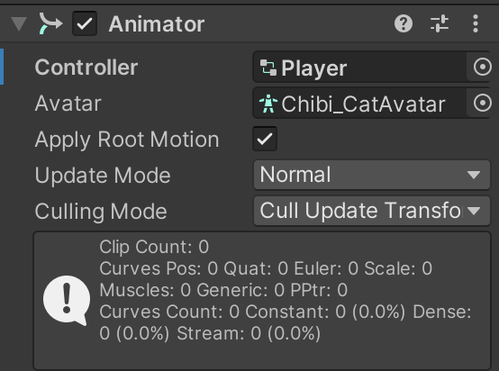 ์ด์ Player ์บ๋ฆญํฐ์ Animator Component๋ฅผ ์ถ๊ฐํ๊ณ ์ง๊ธ๊น์ง ์ค์ ํ Controller๋ฅผ ๋ฃ์ด์ค๋ค.