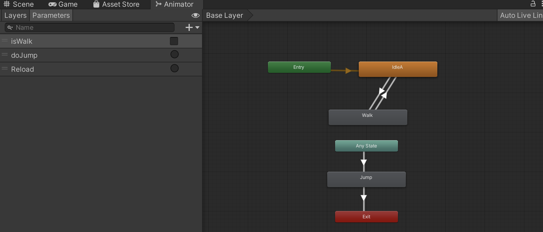 ๋ฐ๋ผ์ Walk ์ ๋๋ฉ์ด์ ์ Bool์ ์ด์ฉํ๊ณ Jump ์ ๋๋ฉ์ด์ ์ Bool์ด ์๋ Trigger๋ฅผ ์ด์ฉํด์ผ ํ๋ค.