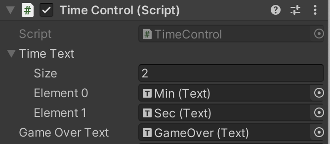 ์คํฌ๋ฆฝํธ๋ฅผ ํ ๋นํ ์ค๋ธ์ ํธ์ ์ธ์คํํฐ ์ฐฝ์์ Time Text์ ์ฌ์ด์ฆ๋ฅผ ์ ํด์ฃผ์ด์ผํ๋ค.