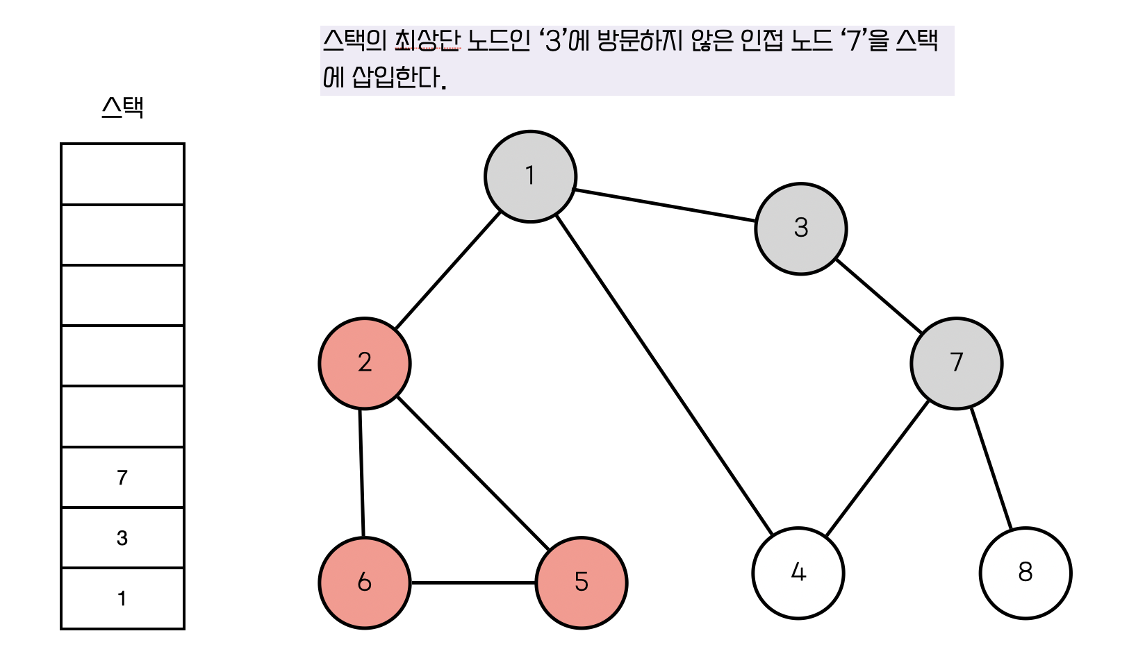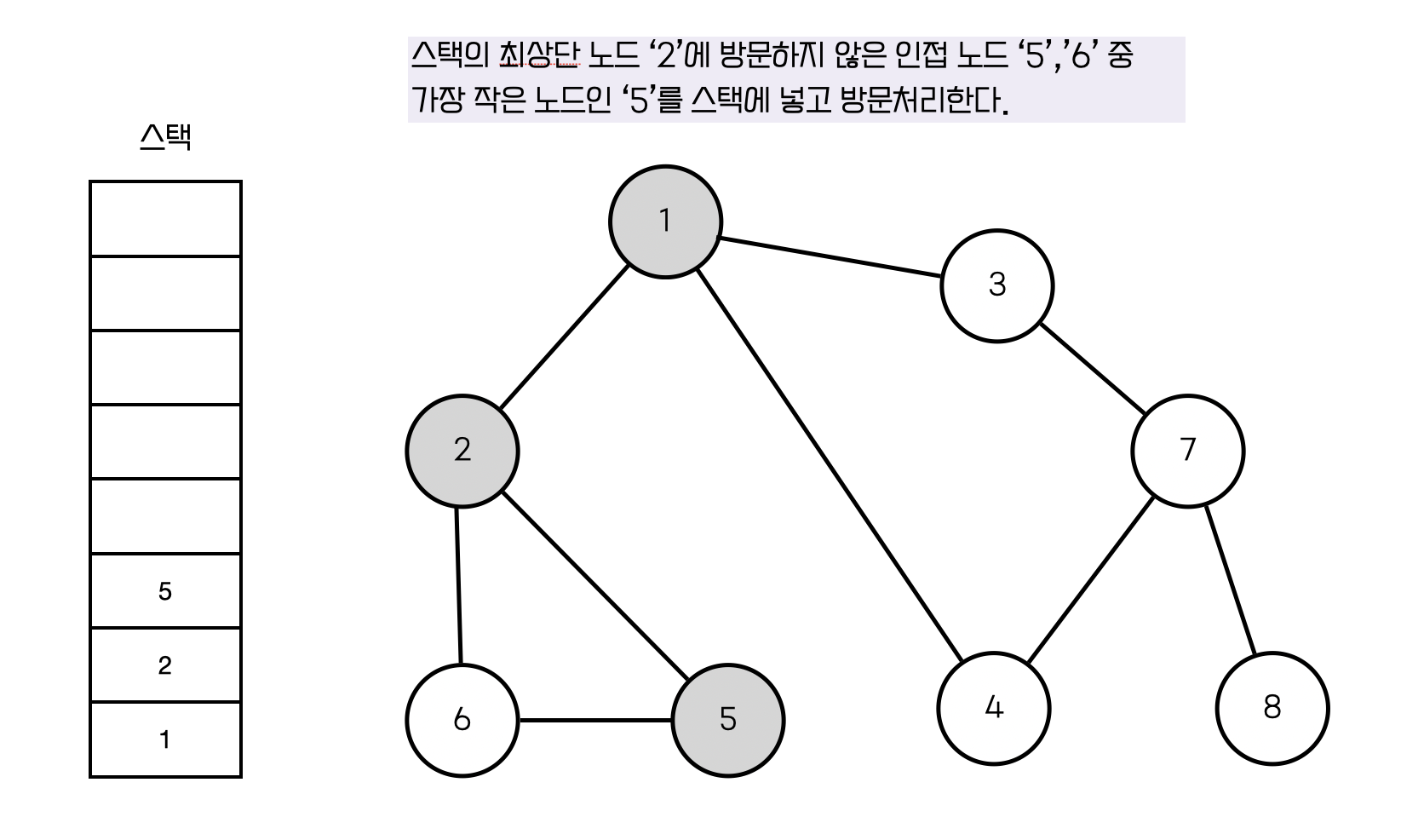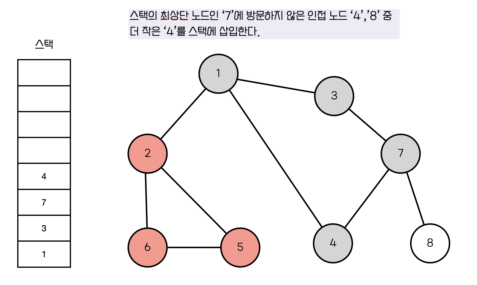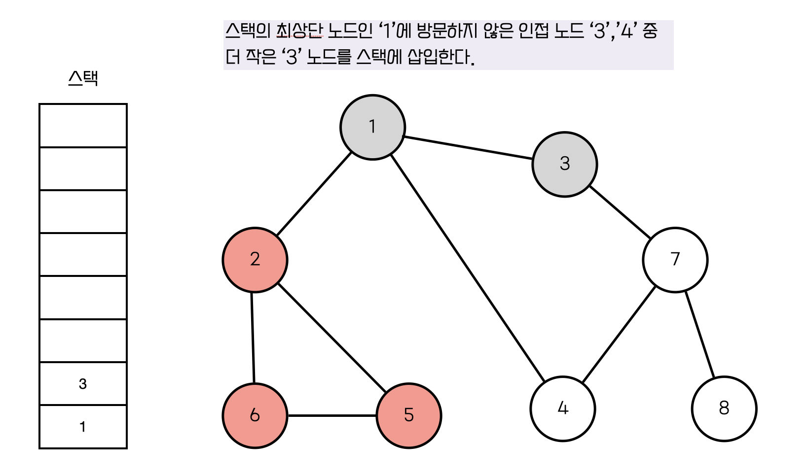 (2) ์คํ์ ์ต์๋จ ๋ ธ๋์ ๋ฐฉ๋ฌธํ์ง ์์ ๋ ธ๋๊ฐ ์๋ค๋ฉด ๊ทธ ์ธ์ ๋ ธ๋๋ฅผ ์คํ์ pushํ๊ณ ๋ค์ ๋์๊ฐ ๋ค๋ฅธ ๋ ธ๋๋ฅผ ๋ฐฉ๋ฌธํ๋ค.
