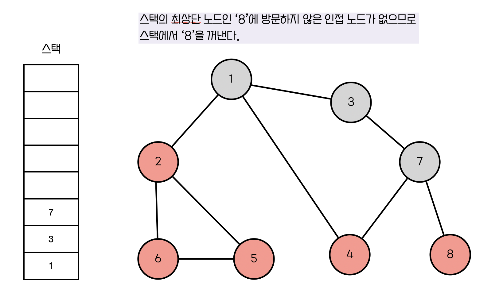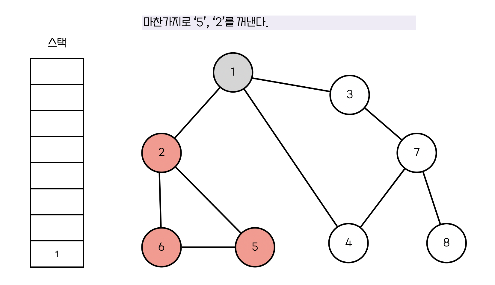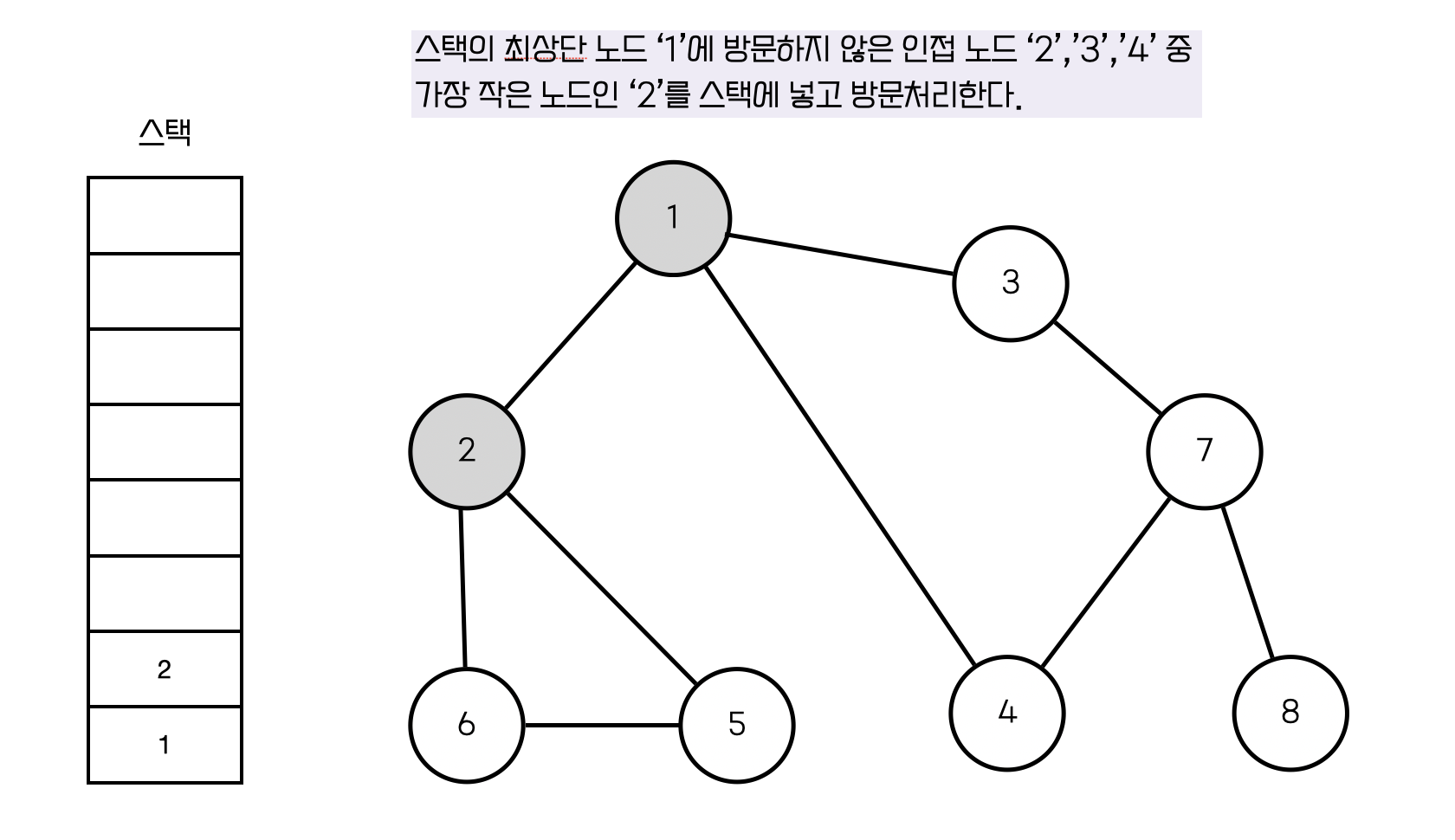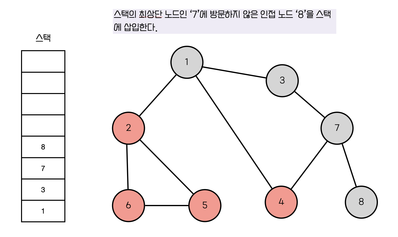 (2) ์คํ์ ์ต์๋จ ๋ ธ๋์ ๋ฐฉ๋ฌธํ์ง ์์ ๋ ธ๋๊ฐ ์๋ค๋ฉด ๊ทธ ์ธ์ ๋ ธ๋๋ฅผ ์คํ์ pushํ๊ณ ๋ค์ ๋์๊ฐ ๋ค๋ฅธ ๋ ธ๋๋ฅผ ๋ฐฉ๋ฌธํ๋ค.