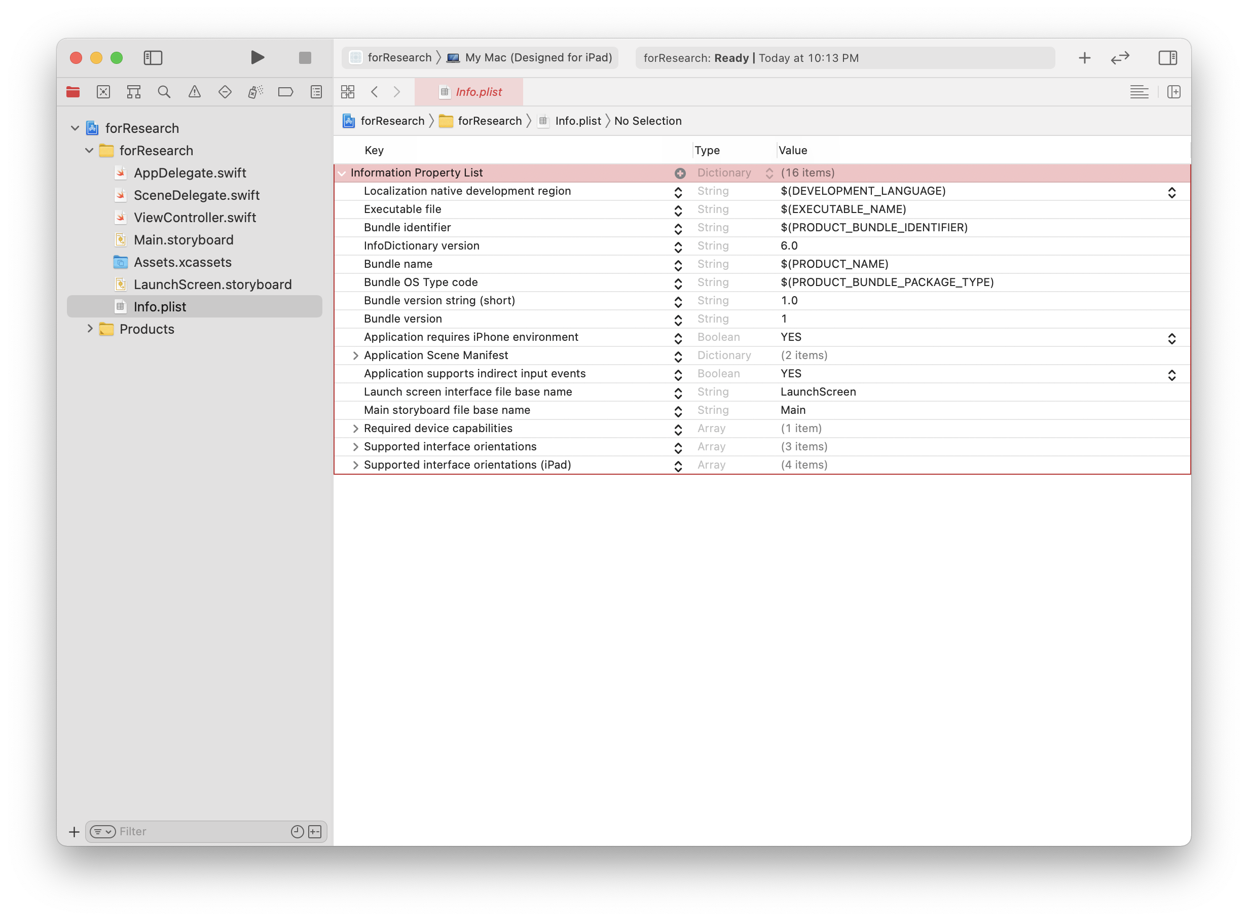 Info.plist๋ Xcode ํ๋ก์ ํธ๋ฅผ ์์ฑํ๋ฉด ์๋์ผ๋ก ์์ฑ๋๋ฉฐ
