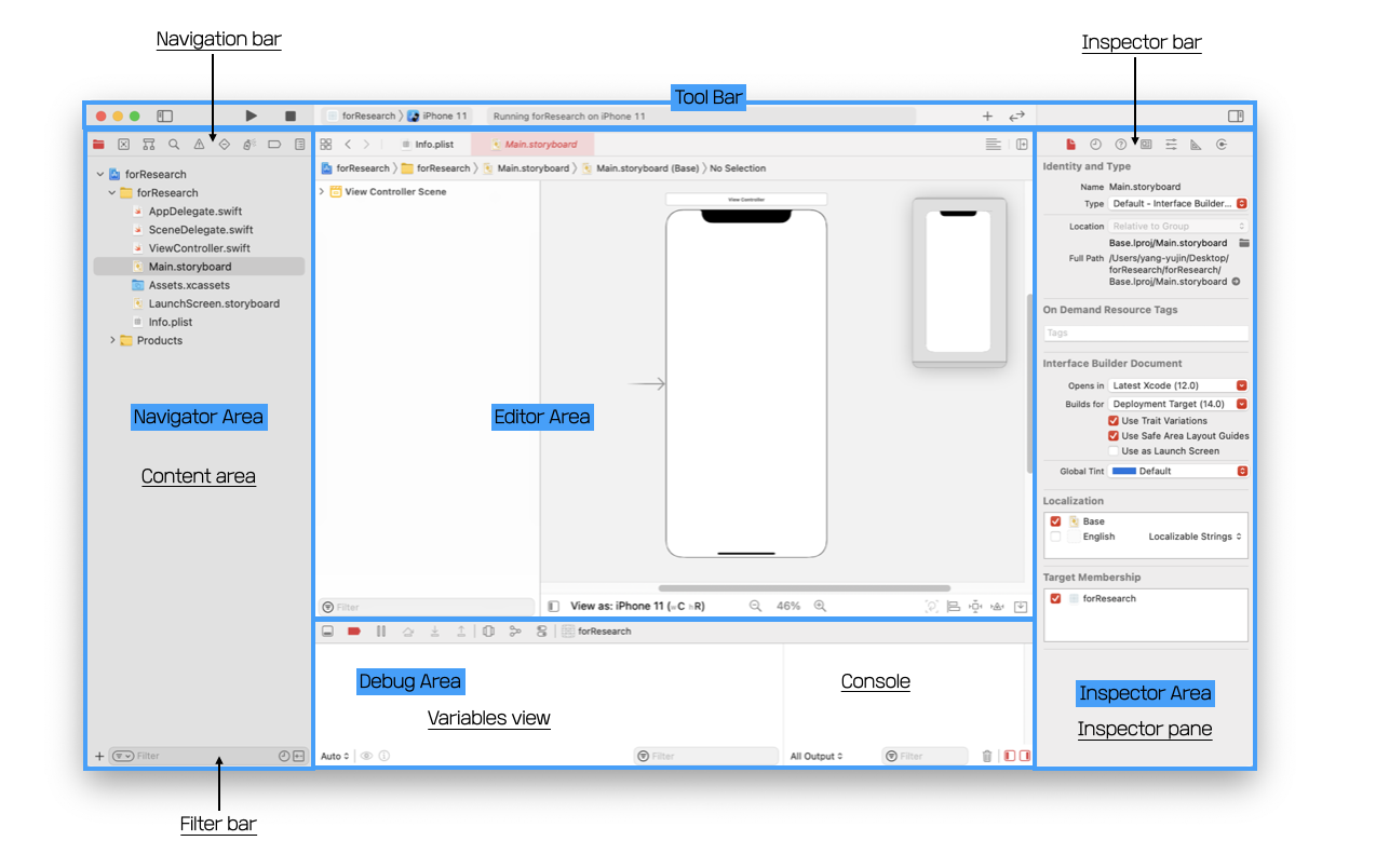- Project navigator: ํ์ผ์ ์ถ๊ฐ, ์ญ์ ๋ฐ ๊ทธ๋ฃนํํ๊ณ ํธ์ง๊ธฐ์์ ํ์ผ์ ์ฐ๋ค.
